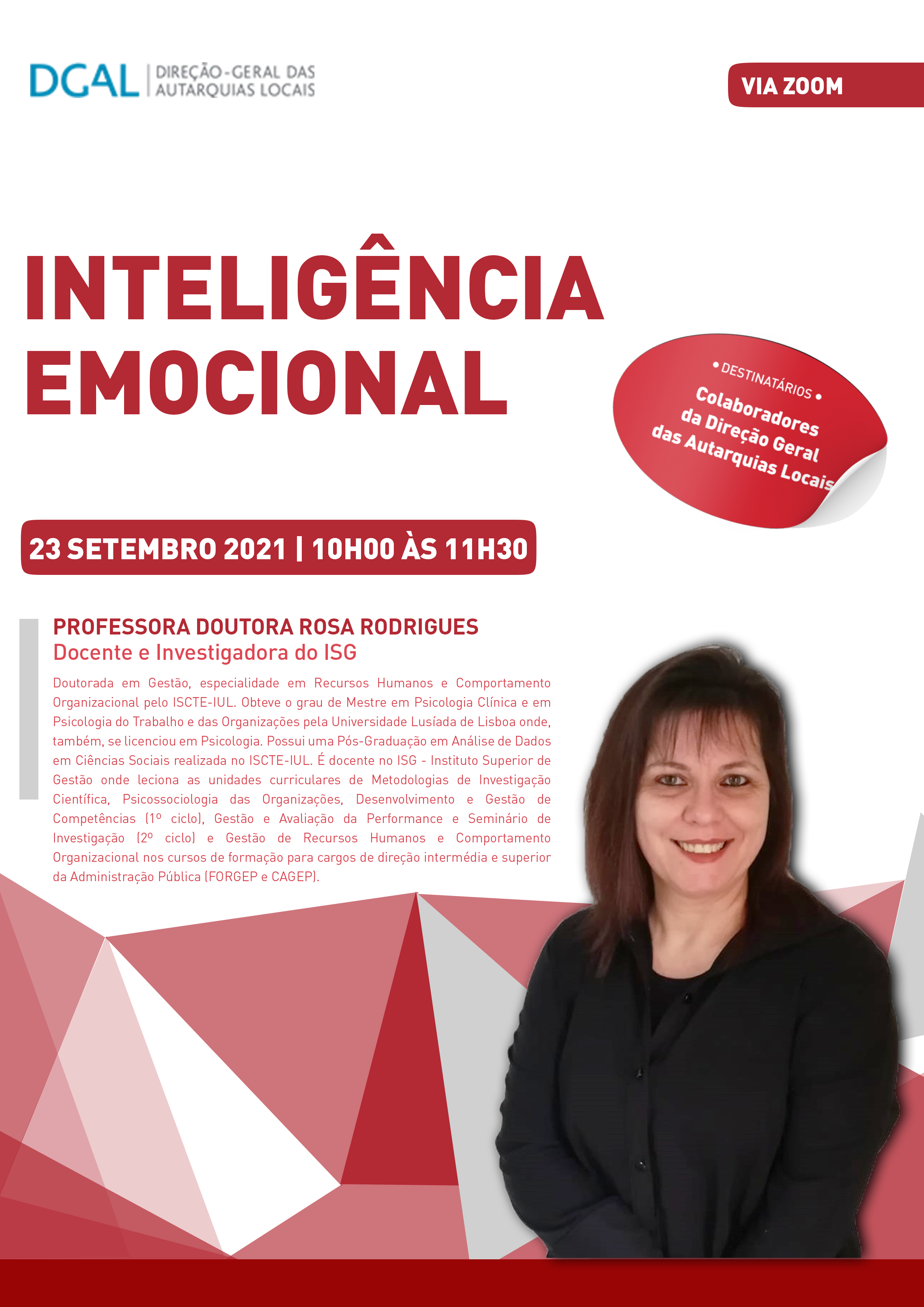 A DGAL – Direção Geral das Autarquias Locais realiza no dia 23 de setembro, pelas 10 horas, um Workshop: “Inteligência Emocional”, ministrado pela Professora Doutora Rosa Rodrigues, Docente e Investigadora do ISG.