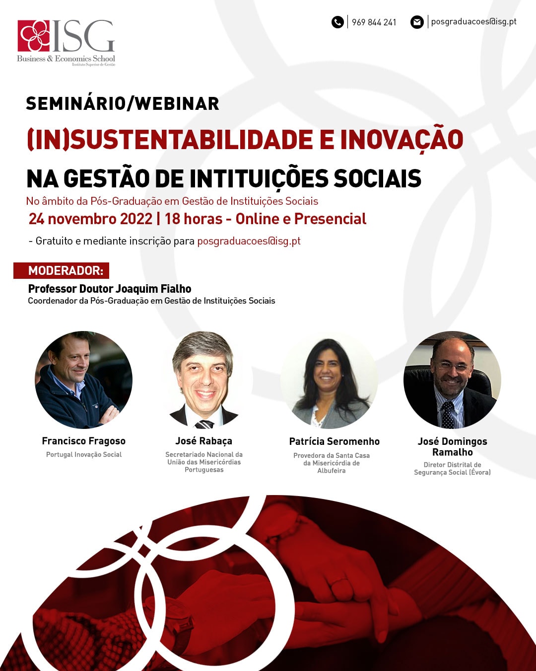 No âmbito da Pós-Graduação em Gestão de Instituições Sociais, o Instituto Superior de Gestão promove o Seminário/Webinar: “(In)Sustentabilidade e Inovação na Gestão de Instituições Sociais”, no dia 24 de novembro 2022, pelas 18 horas.